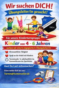 - Übungsleiter/in für Kinderturnen gesuchtFür unsere Kinderturngruppe mit Kindern im Alter von 4 – 6 Jahren suchen wir eine(n) enagierte(n) Übungsleiter/in. Du hast Spaß an einer ehrenamtlichen Tätigkeit und an der Arbeit mit Kindern? Dann meld Dich gerne bei...