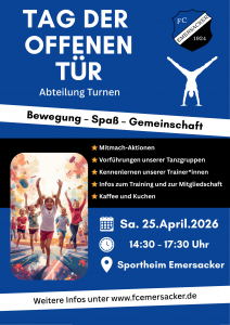 - Tag der offenen Tür – Abteilung TurnenDie Abteilung Turnen des FC Emersacker lädt alle Interessierten am 25. April 2026 ab 14.30 Uhr zum Tag der offenen Tür ein. Es erwartet Euch ein tolles Programm: 14:30 Smily Dance mit Ayline und Sarah 15:00...