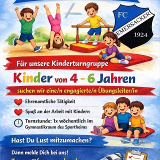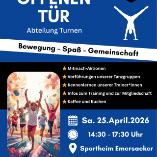 Die Abteilung Turnen des FC Emersacker lädt alle Interessierten am 25. April 2026 ab 14.30 Uhr zum Tag der offenen Tür ein. Es erwartet Euch ein tolles Programm: 14:30 Smily Dance mit Ayline und Sarah 15:00...