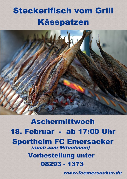 Der FC Emersacker lädt wieder zu frischem Steckerlfisch vom Grill sowie leckeren Kässpatzen am Aschermittwoch ein.