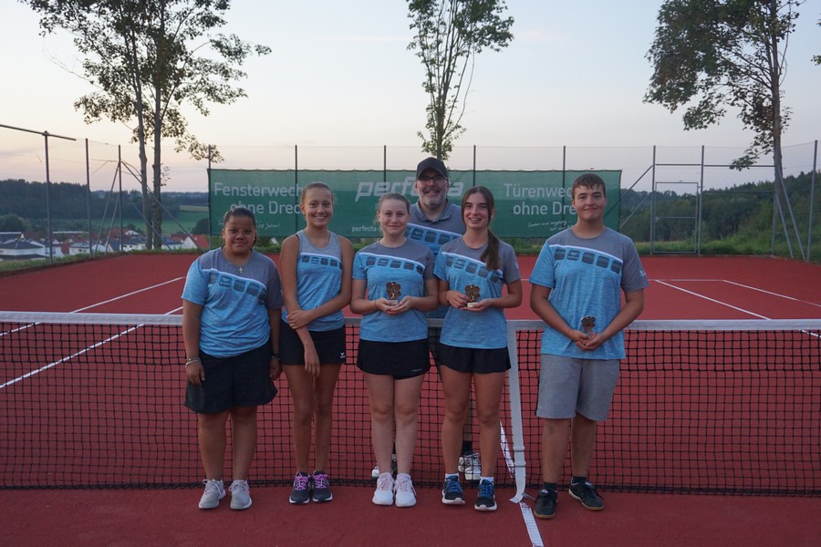 Bei den Junior/innen mit deren Trainer Jürgen Müller stand wieder die Doppelvereinsmeisterschaft auf dem Programm. In packenden Spielen bei teils tropischen Temperaturen setze sich am Ende Emma Müller vor Sebastian Peppler und Sara Kaim durch.